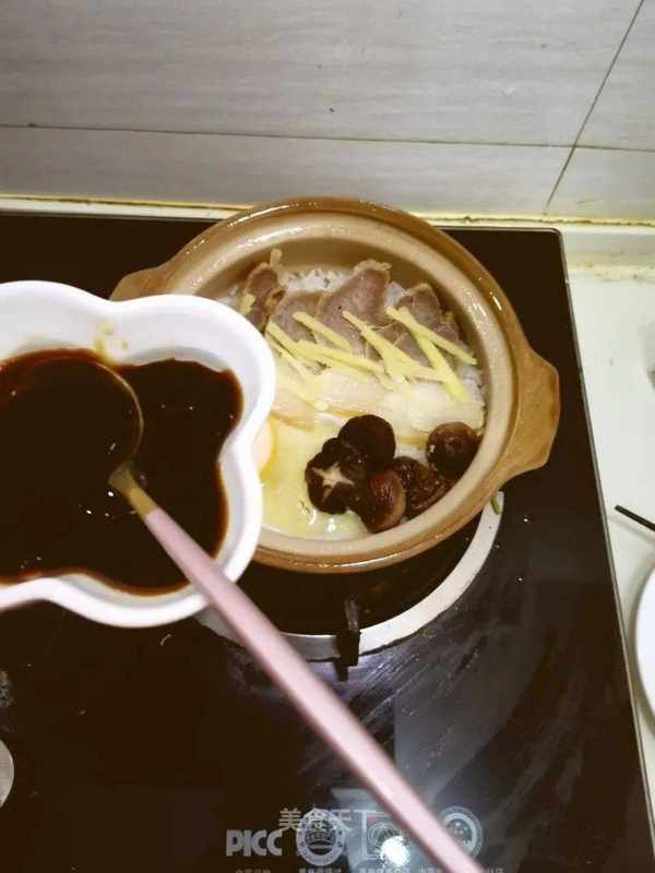 5. 趁煮米饭过程中,调好料汁,生抽2勺,老抽1勺,耗油1勺,玉米油1勺,清水2勺搅拌均匀。
