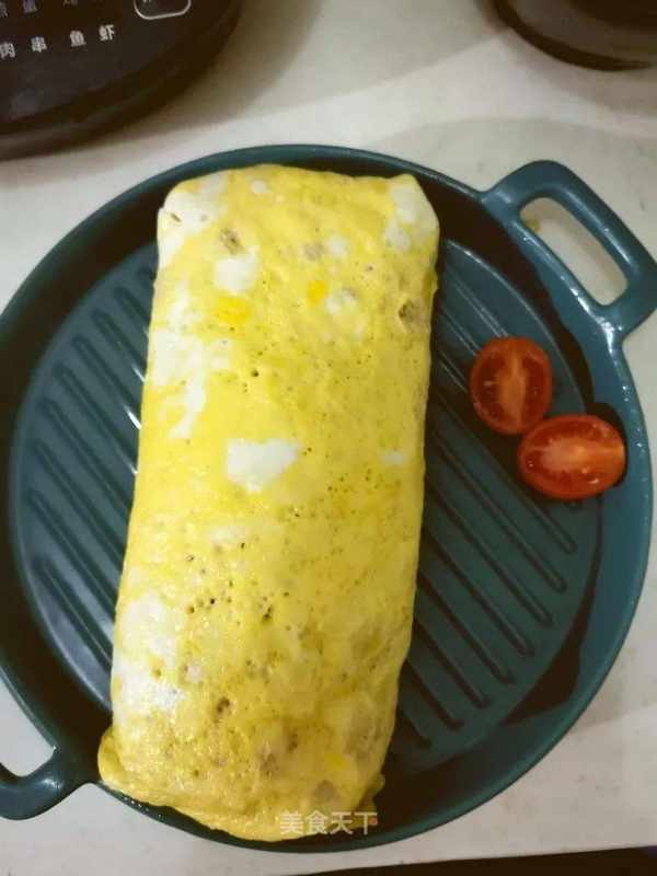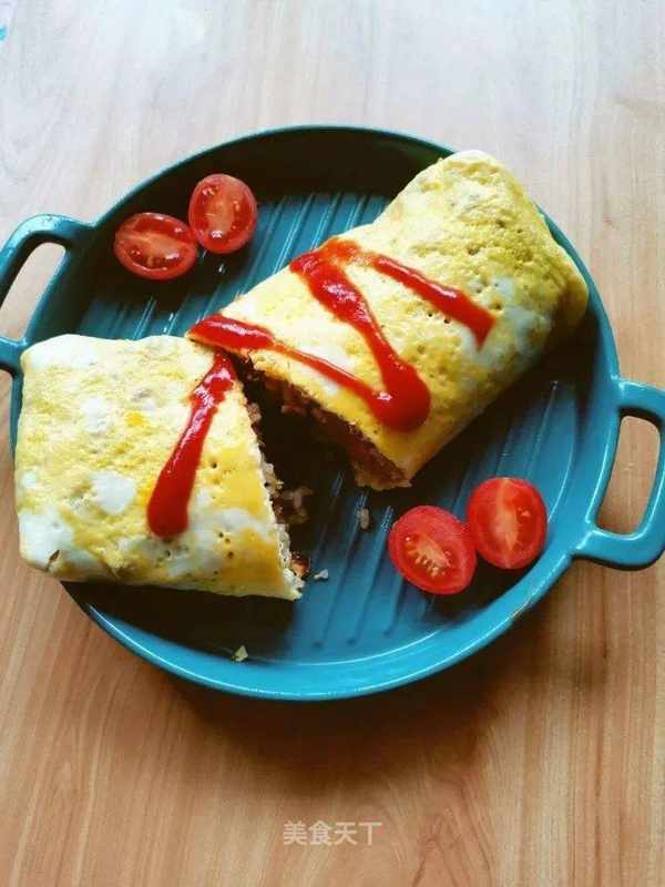 12. 提前摊好的蛋皮铺上炒好的蛋炒饭,头尾整理一下就可以了。