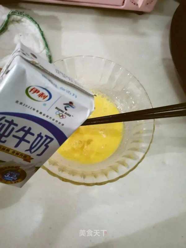1. 选2个鸡蛋打散,放入纯牛奶搅拌均匀。
