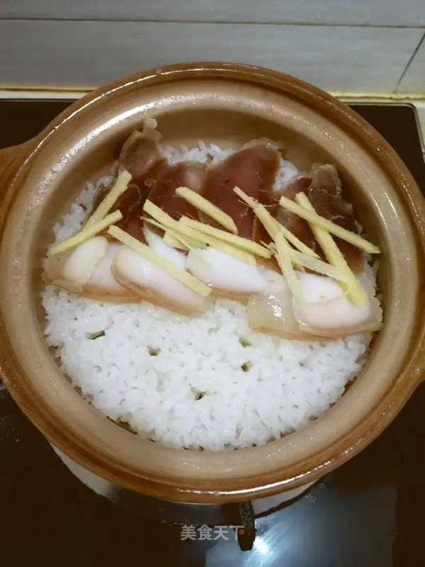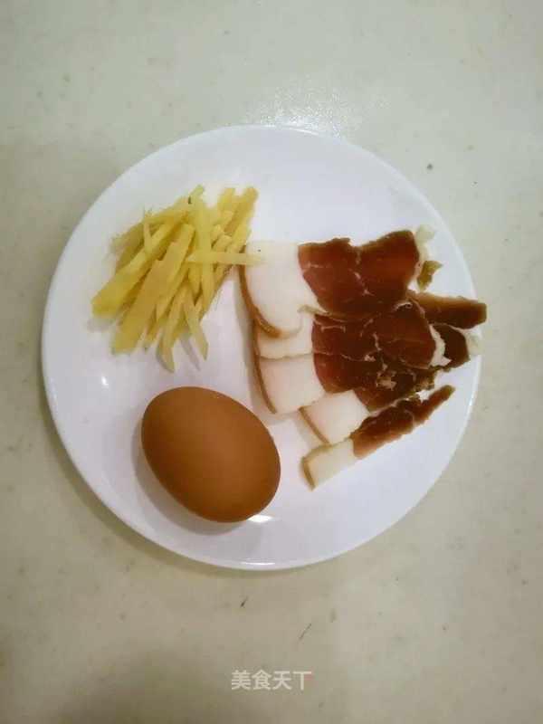 6. 中火煮开后用筷子插几个洞转小火煮5分钟,加入腊肉放入姜丝煮5分钟。