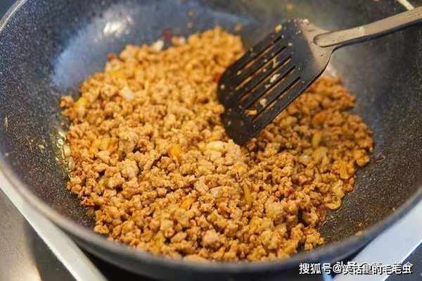 2、起锅烧油下入姜蒜炒香后下入肉沫炒至变色,撒一些胡椒粉和老抽增添底味;