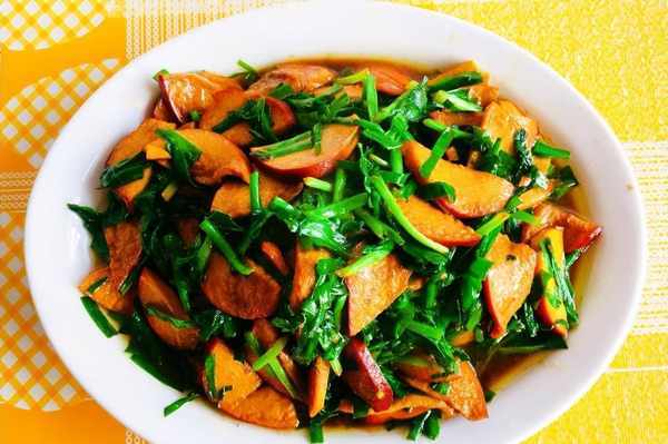 将韭菜洗净,沥干水分,切成小块。素鸡洗净,切成任意形状的薄片。