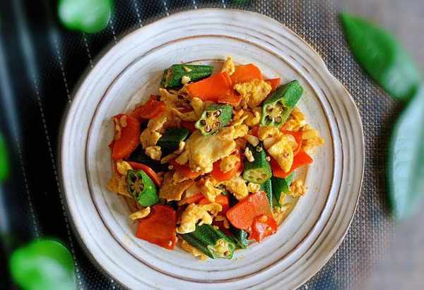 锅内放油,烧热,倒入蛋液,搅成小块捞出。然后倒入切好的胡萝卜翻炒至变软,再倒入秋葵翻炒。