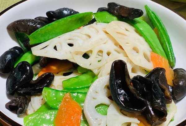 锅中加水,烧开后放入藕片,煮一分钟捞出。倒入荷兰豆和胡萝卜片,煮半分钟后取出。然后倒入黑木耳煮两分钟捞出。