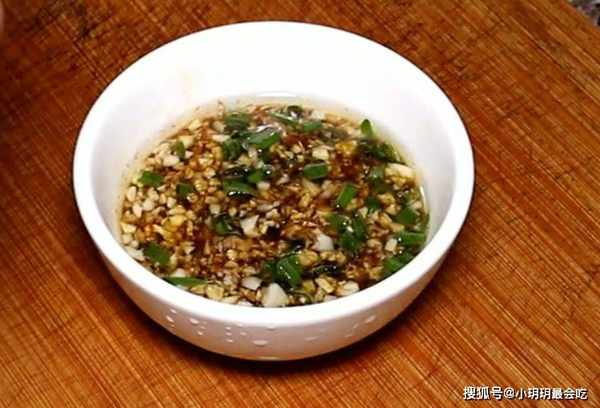 8.摆盘,撒上葱花,蘸着料汁吃。