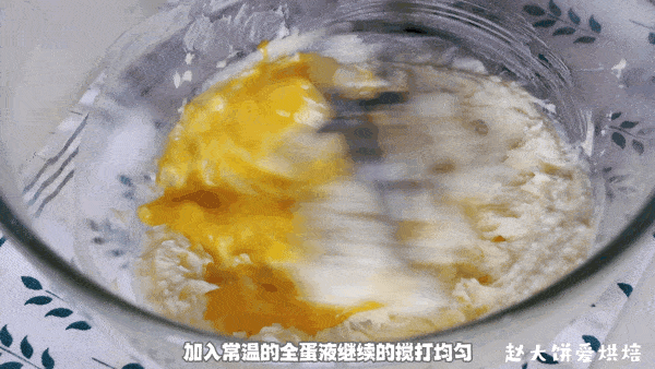 4.加入常温全蛋清继续打匀(也可以加入常温蛋清,口感更酥脆)