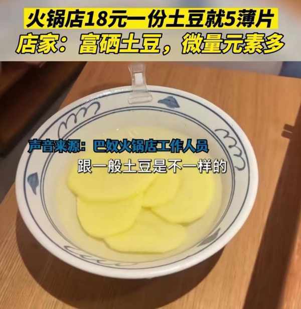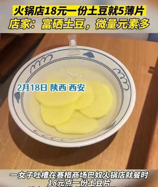 近日,陕西西安,一女子吐槽自己在火锅店点了一份土豆18元,可端上来却只有5片薄片。