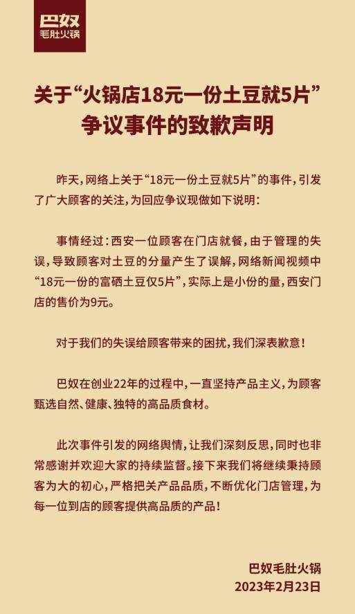 不过就在今日,这家火锅店发布了公告,表示称网上热议的天价土豆实际是小份土豆,售价实际为9元,在西安的门店价格为9元。而网友爆料这家火锅店的富硒土豆进货价为一斤3元多,以9元5片计算,利润也是相当之高的。
