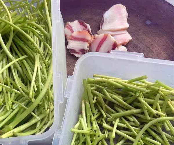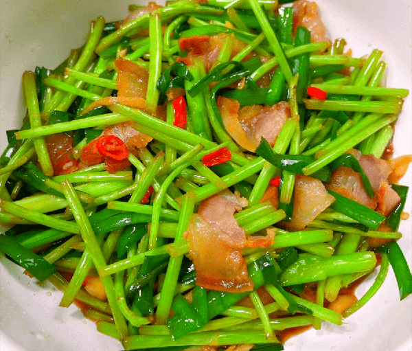 3、起锅烧热,倒入适量的植物油,然后放入腊肉片翻炒,炒出腊肉中的油分,将腊肉炒至透明时扒拉到锅边,然后放入蒜末、姜末和小米辣圈,炒出香味后再放入芦蒿,继续大火翻炒1分钟后加入适量的盐、白糖和鸡精调味,翻炒均匀后即可出锅。