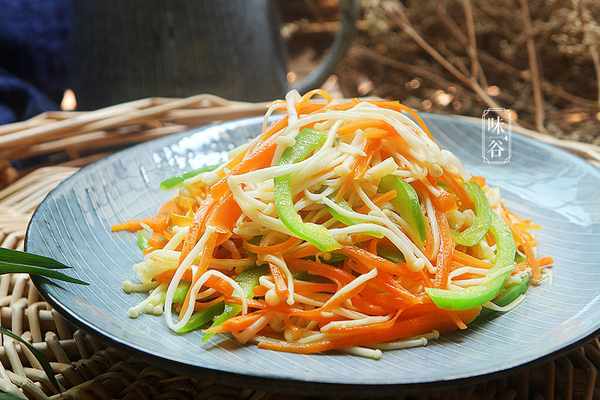 【食材】:胡萝卜 适量、金针菇 适量、生抽 1勺、香醋 1勺、糖 少许、盐 1小勺、灯笼椒 1个、