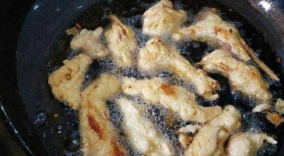 5、这时候调大火,将油温继续加热,烧至7成热,再将酥肉放入油锅内复炸一边,复炸是为了酥肉外边的面糊更加的酥脆,里边肉更加鲜嫩,所以复炸时间不要太长,大概30分钟左右,必须出锅,时间过长就会导致外边不是金黄色,也不够酥脆,并且里边的里脊肉也不鲜嫩了。
