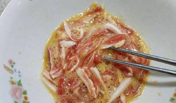 1、选一块上好的里脊肉将它顺着纹理切成薄片,接着在用刀背轻轻的敲打几下,这样是为了肉嫩,并且入味。敲打网之后,给它切成里脊肉条,长5厘米,宽1厘米的长条。给它装入盆中,里边加适量的料酒,生抽,盐,五香粉,花椒粉,将它搅拌均匀,给它腌上20分钟。