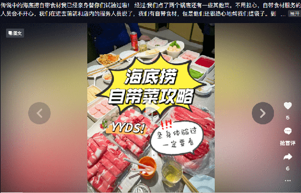 可是在这之后,各种视频平台上不断有自带食材去海底捞吃火锅的视频。有的博主还拍了自带食材吃火锅的攻略。