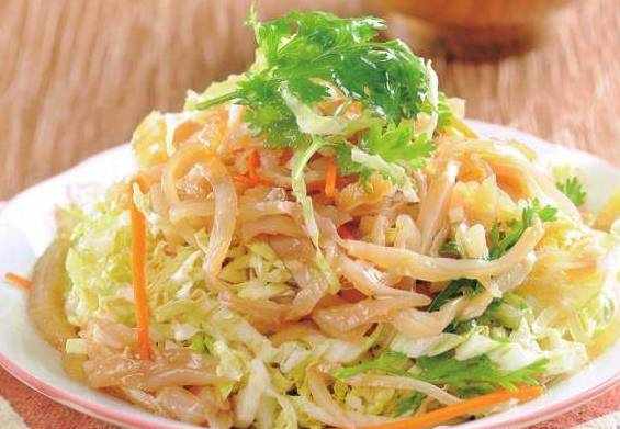 准备材料:白菜200克,海蜇150克,胡萝卜10克,蒜泥10克,香菜10克,盐、,味精、白糖、醋、生抽、香油各适量