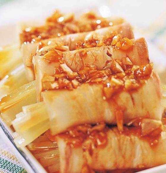 准备材料:猪五花肉500克,莴笋200克,蒜泥汁适量,姜、花椒、盐、浓缩鸡汁、辣椒油、葱花各适量