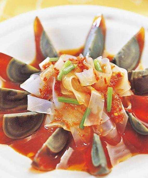 蜇头用冷水浸泡10小时,中间换3次水,直至咸味泡掉。将蜇头片成片,入开水中汆2秒钟,即刻捞出。
