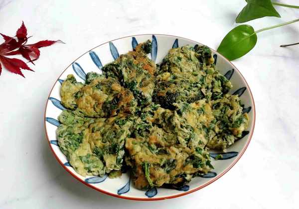 4、锅中油烧热,倒入枸杞芽蛋液,中火煎至两面金黄。