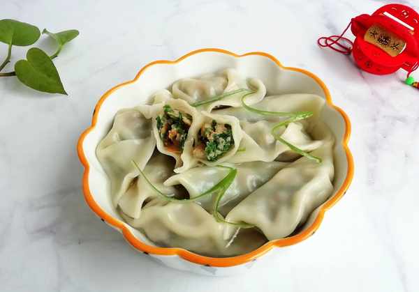 5、饺子皮边缘蘸一圈水,放入荠菜肉馅,包成饺子状。