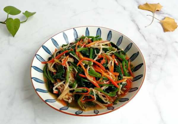 1、菠菜和金针菇分别洗净,切两段,胡萝卜去皮洗净切丝。