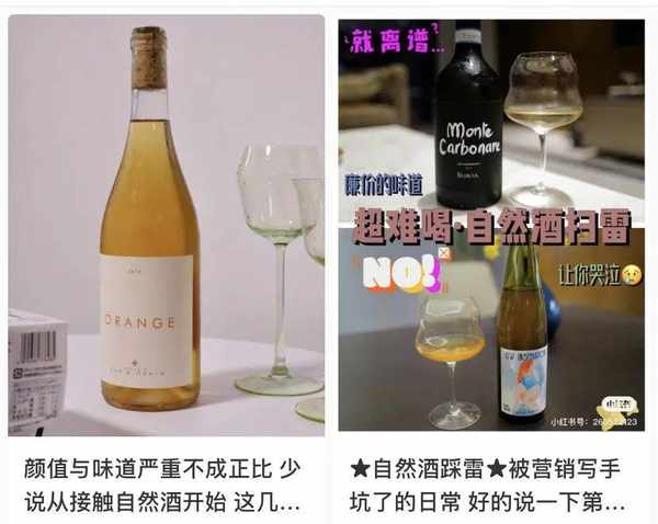 在小红书APP上,输入“自然酒”三个字,能看到不少负面的内容,如“自然酒难喝、踩雷”、“千万别碰自然酒”、“99%的人不推荐买自然酒”、“不建议小白喝自然酒”,也有内容称自然酒为“智商税”。另有推荐自然酒的,标题则是“怕踩雷的请进”,也有博主在做视频销售自然酒时,会先说有的自然酒“只有酵母味,缺乏果香”。