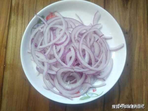 2、洋葱剥去外皮,只保留鲜嫩的部分,切成细丝,装入盘中,越细越好。