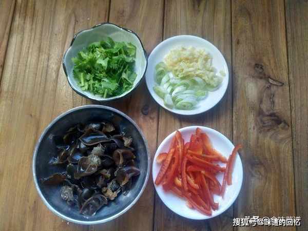 3、配菜切一下,青红椒切成丝,木耳、葱、蒜切成片。