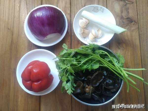 1、准备食材洋葱、香菜、青红椒、葱、蒜、木耳,价格便宜,木耳我用的东北黑木耳,口感爽脆,需要提前泡4个小时。