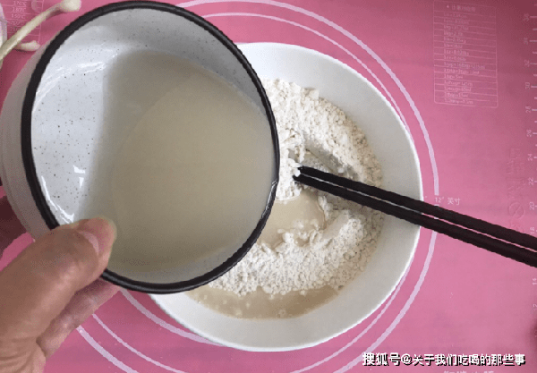 等到酵母水出现很多气泡,说明酵母是有活性的,并且活性已经激活,把酵母水倒进面粉中,搅拌成面絮后和成光滑柔软的面。