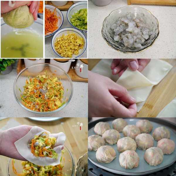 早餐营养包用胡萝卜、虾仁、鸡蛋和西葫芦做馅,营养全面且均衡,用馄饨皮做皮不用和面很省事,包好之后简单蒸几分钟即可。