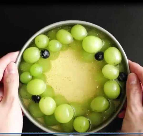 食材:玫瑰香葡萄1串蓝莓少许-生奶酪蛋糕》奶油奶酪100克鲜奶油100克酸奶100克细砂糖30克柠檬汁1大勺明胶5克水1大勺-《蛋糕底》水果麦片60克黄油30克-《白葡萄酒冻》白葡萄酒200毫升明胶8克水2大勺细砂糖50克柠檬汁1大勺金箔少许-制作步骤:1.用于制作生奶酪蛋糕的那份明胶在放入搅拌机之前先放入微波炉用500W加热20秒使其融化。2.奶油奶酪放在室温下软化(也可以从冷冻室里拿出来之后直接放入微波炉用200W加热3分钟左右使其软化)3.水果麦片用擀面杖碾碎后加入融化的黄油搅匀,平铺在模具底层压实,然后放入冷冻室冷冻定型。4.把葡萄一粒粒的揪下来。5.把制作生奶酪蛋糕的全部材料放入搅拌机,开机搅拌。6.把搅拌好的材料倒入模具中冷冻定型。7.在小锅中加入白葡萄酒和细砂糖加热。沸腾后关火,加入明胶、柠檬汁和金箔,搅拌至明胶融化为止。然后放入冰水中冷却到液体变得稍有凝结为止。8.待生奶酪蛋糕的部分成型之后在上面呈环状的摆上葡萄和蓝莓,中心部分空出来。9.摆好后浇上熬好的白葡萄酒汁。10.再次放入冷冻室冷冻定型。