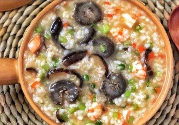 食材:大米、海参、大虾、泡发香菇、胡萝卜 芹菜、小葱、白胡椒粉、生抽、盐