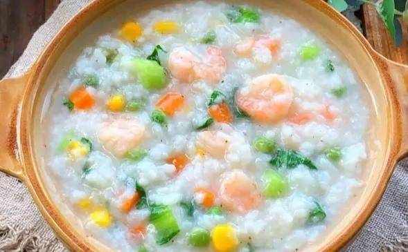 食材:米一碗、水3碗、虾仁10个、玉米粒 豌豆粒、胡萝卜粒适量、青菜