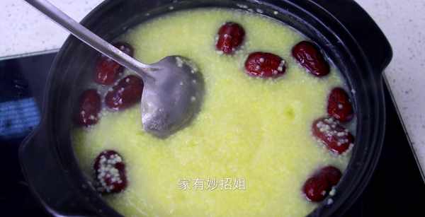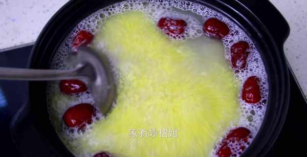大概熬煮上十分钟左右,我们根据自己的喜好,可以放入一点冰糖和红枣,再继续熬煮。注意,我们煮的时候要边煮边搅拌,防止发生粘锅的情况。