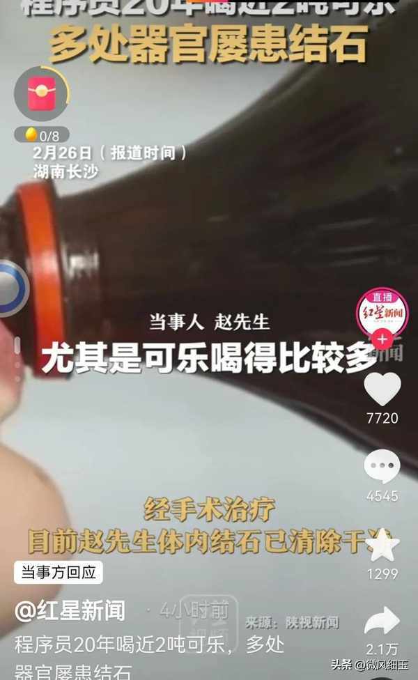 二十年来喝了近两吨可乐,近期因输尿管结石被送进医院。据了解,赵先生患结石已经多年,之前一直没当回事,今年复发检查后发现肾脏、输尿管内都有结石。经手术治疗,目前赵先生体内结石已清除干净。