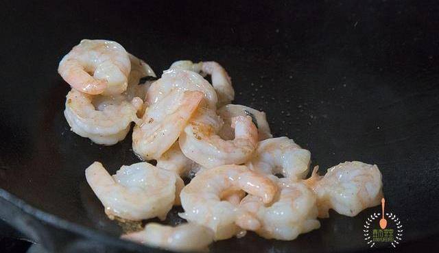 4.锅内放少量油先将鲜虾肉煸炒到九分熟。表面微微变红即可。盛出备用。
