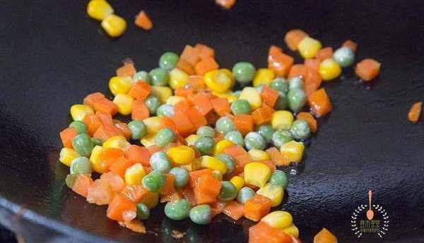 5.然后用炒虾剩下的油先将胡萝卜丁、青豆玉米粒炒香。