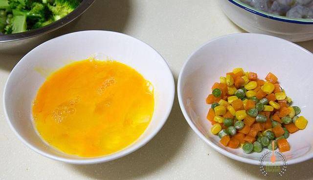 【食材原料】鲜虾、鸡蛋、米饭、胡萝卜、青豆、甜玉米粒、西兰花。