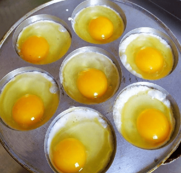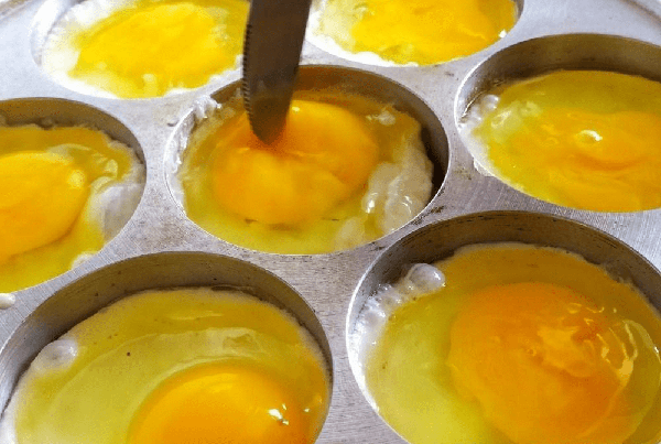 步骤三:烧热模具,在每个圆坑里刷上植物油(多一点),然后打入鸡蛋。