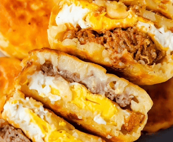 步骤六:把凝固的面饼+鸡蛋+肉馅,一同铲出来,往圆坑里倒入一大勺面糊,再把面饼鸡蛋肉馅组合倒扣进面糊里,按压,使面糊从四周向上涌溢,包裹汉堡的侧面,这时候鸡蛋汉堡就组装好了。