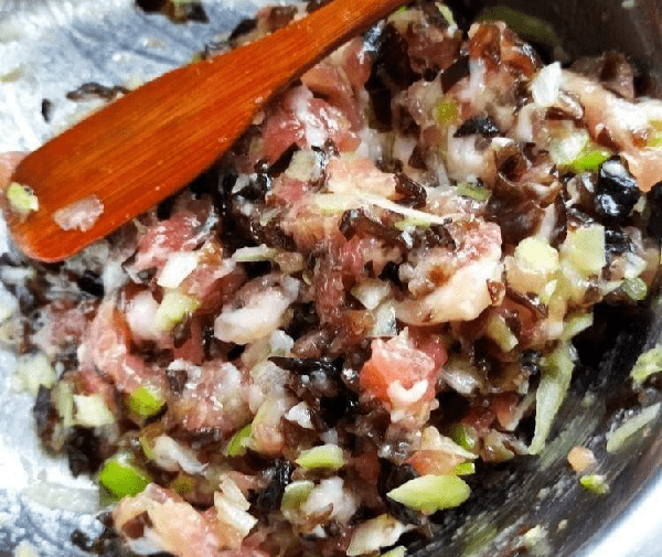 步骤二:调肉馅,五花肉馅加入调料葱花木耳碎植物油等,搅匀上劲,备用。