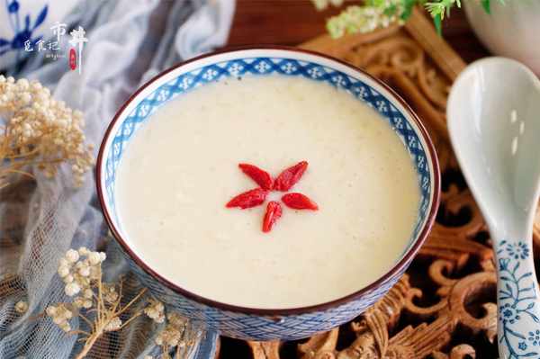 5、煮到大米开花后,放入山药泥搅拌均匀,加枸杞和少许冰糖,煮2分钟至完全融化后关火盛入汤碗中食用。
