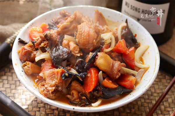 【主料】:胡萝卜一根、三黄鸡半只、茶树菇