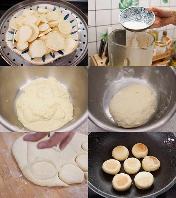 2、山药去皮后洗净,切片放进蒸锅中蒸熟,倒入碗中压成山药泥。
