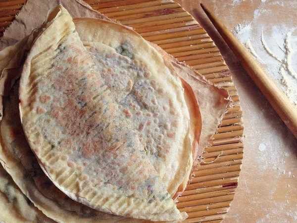 不放葱花、调料,直接烙出的馍,没什么味道,但是顶饱、好放,需要就菜或者酱,方能成就美味。