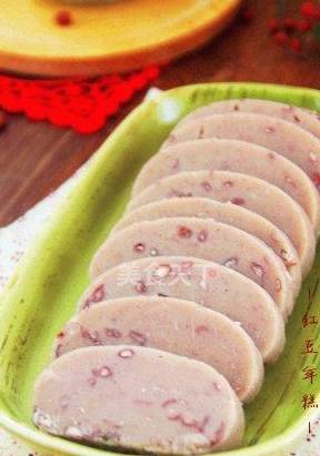 12揉到面团基本微温,基本不烫手的时候,将面团压扁,从中分成几块,我分了3块。将剩下的颗粒蜜红豆,擦干表面水分后,铺在面团表面。蜜红豆可以分次铺完,不用一次性用完。然后将面片叠加再一起,用掌心压扁,再从中间切开;