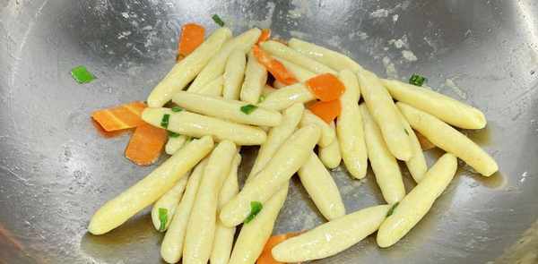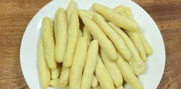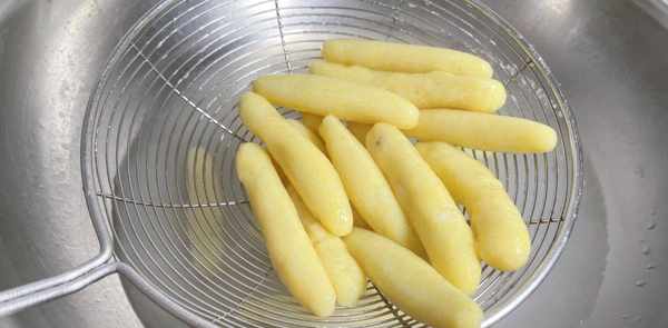 4、锅中倒入足量的水,大火烧开水,将做好的土豆鱼一条一条放入锅中,用铲子小心铲起,不要粘在一起。当所有的小土豆鱼都浮在水里时,就可以捞出来放到凉水里降温。冷却后的土豆鱼口感滑润有弹性,不易粘锅,口感更持久。