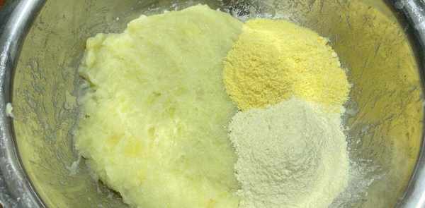 2、将土豆片放入蒸锅蒸15分钟左右。用叉子轻松地推入土豆片。土豆片趁热用铲子压入土豆泥中,加入适量的大黄米粉。1、糯米粉,用筷子倒入搅拌成大粒,最后用一次性手套揉成光滑的面团,在面团表面刷一层食用油,醒面10分钟左右。