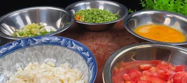 胡萝卜去皮切半,长豆切段,去皮西红柿切段。取适量雪花葱白切小块,生姜切片,葱叶切段,葱花切碎,鸡蛋两个打入碗中拌匀。
