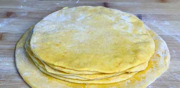 取第一个大面食剂排成一圈卷成一个大面食盘,然后把另一个面食滚圆压扁卷成一个小面食盘。