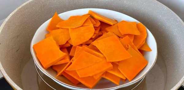 南瓜去皮切半,去籽,切成薄片,装盘上锅蒸15分钟。